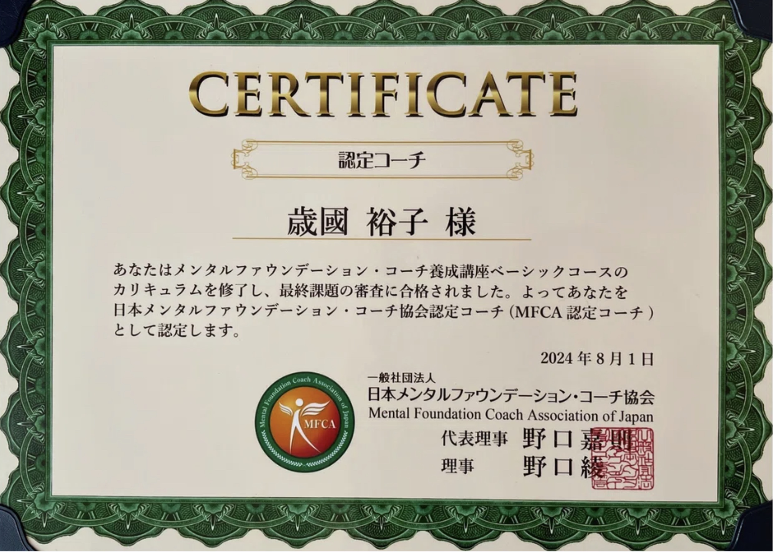 2024/08/01 日本メンタルファウンデーション・コーチ協会 MFCA(Mental Foundation Coach Association of Japan)認定コーチになりました