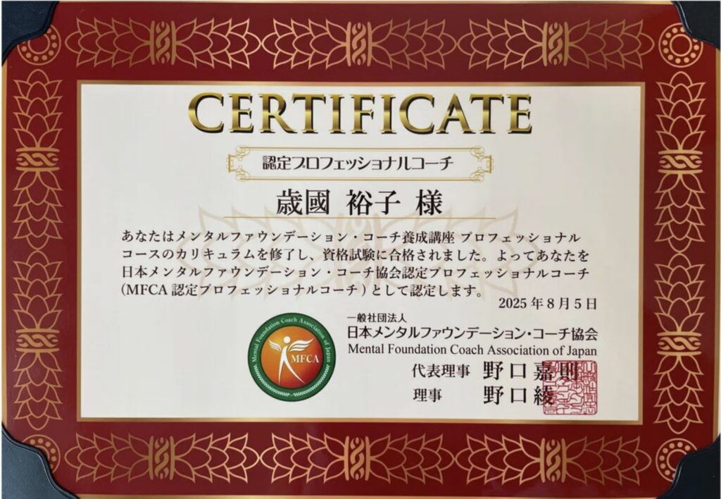2025/08/02 日本メンタルファウンデーション・コーチ協会 MFCA(Mental Foundation Coach Association of Japan)認定プロフェッショナルコーチになりました